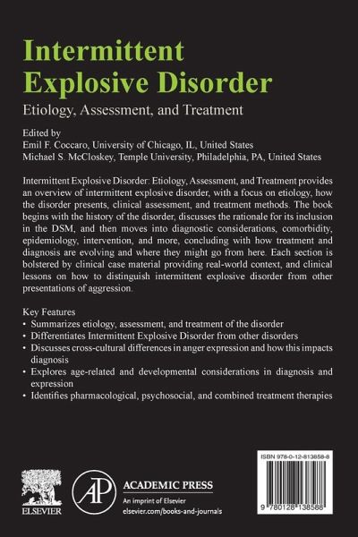 Intermittent Explosive Disorder: Etiology, Assessment, and Treatment provides a complete overview on this disorder, focusing on its etiology, how the disorder presents, and the clinical assessment and treatment methods currently available. The book presents the history of the disorder, discusses the rationale for its inclusion in the DSM, and includes diagnostic considerations, comorbidity, epidemiology, intervention, and how treatments have evolved. Each section is bolstered by clinical case material that provides real-world context and clinical lessons on how to distinguish intermittent explosive disorder from other presentations of aggression.