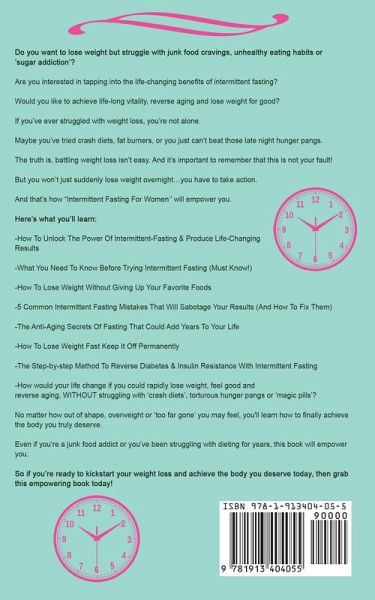 Do you want to lose weight but struggle with junk food cravings, unhealthy eating habits or ‘sugar addiction’? Are you interested in tapping into the life-changing benefits of intermittent fasting? Would you like to achieve life-long vitality, reverse aging and lose weight for good? If you’ve ever struggled with weight loss, you’re not alone. Maybe you’ve tried crash diets, fat burners, or you just can’t beat those late-night hunger pangs. The truth is, battling weight loss isn’t easy. And it’s important to remember that this is not your fault! But you won’t just suddenly lose weight overnight…you have to take action. And that’s how "Intermittent Fasting For Women‘’ will empower you. Here’s what you’ll learn: How To Unlock The Power Of Intermittent-Fasting & Produce Life-Changing Results What You Need To Know Before Trying Intermittent Fasting (Must Know!) How To Lose Weight Without Giving Up Your Favorite Foods 5 Common Intermittent Fasting Mistakes That Will Sabotage Your Results (And How To Fix Them) The Anti-Aging Secrets Of Fasting That Could Add Years To Your Life How To Lose Weight Fast Keep It Off Permanently The Step-by-step Method To Reverse Diabetes & Insulin Resistance With Intermittent Fasting How would your life change if you could rapidly lose weight, feel good and reverse aging, WITHOUT struggling with ‘crash diets’, torturous hunger pangs or ‘magic pills’? No matter how out of shape, overweight or ‘too far gone’ you may feel, you'll learn how to finally achieve the body you truly deserve. Even if you’re a junk food addict or you’ve been struggling with dieting for years, this book will empower you. So if you’re ready to kickstart your weight loss and achieve the body you deserve today, then purchase this empowering book today!