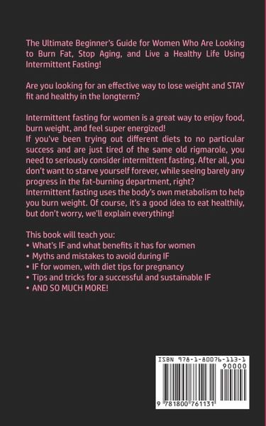 The Ultimate Beginner's Guide for Women Who Are Looking to Burn Fat, Stop Aging, and Live a Healthy Life Using Intermittent Fasting! Are you looking for an effective way to lose weight and STAY fit and healthy in the longterm? Intermittent fasting for women is a great way to enjoy food, burn weight, and feel super energized! If you've been trying out different diets to no particular success and are just tired of the same old rigmarole, you need to seriously consider intermittent fasting. After all, you don't want to starve yourself forever, while seeing barely any progress in the fat-burning department, right? Intermittent fasting uses the body's own metabolism to help you burn weight. Of course, it's a good idea to eat healthily, but don't worry, we'll explain everything! This book will teach you:What's IF and what benefits it has for women Myths and mistakes to avoid during IF IF for women, with diet tips for pregnancy Tips and tricks for a successful and sustainable IF AND SO MUCH MORE! If you've been worried about how IF could impact your body and hormones, worry no more! This book is the ultimate guide to intermittent fasting for women! So Scroll up, Click on 'Buy Now', and Get Your Copy!