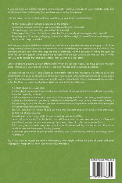 If you are keen on making impactful and sustainably positive changes to your lifestyle, body and mind using natural techniques, then you have come to the right place. Let's see what you have tried until now to achieve a total body transformation: All the 'clean eating' options available on the internet? Consuming copious amounts of various supplements every morning? Hitting the gym and sweating yourself off to eternity? Following all the 'crash diet' options given by friends, family, and everyone else around? Spending tons of money on buying potions that deliver magical detoxification and weight loss results within days or weeks? And yet, you see your reflection in the mirror, and what you see doesn't make you happy at all. After trying so many options, perhaps, certain body parts are reflecting the results of your hard work. For example, maybe your arms and legs are fine or perhaps, too thin because of hitting the gym too often for your own good? What about the pockets of fat all over your sides? And your belly? What can you do to reduce that stubborn visceral fat? Sounds like your story? Lots of problems despite so much effort, right? What do you do? Again, you have come to the right place. This book is your answer to the myriad body fitness and weight loss problems. This book traces the history and success of intermittent fasting that has been in existence since time immemorial. This book deals with one of the most natural and long-standing methods of losing excess stored fat, and consequently achieving weight loss, excellent body fitness, and overall improvement in health. Here are some highlights of what you can find inside this book: It is NOT about any crash diet. It talks about ancient and tried-and-tested methods of eating that have benefitted humankind since the beginning of time! It talks about one of the most natural ways of managing your food and energy requirements. It gives you intricate (and yet easily understandable) scientific basis on why intermittent fasting is the best way to lose fat. You will see how wise our ancestors were even when they had no access to sophisticated labs and resources. You will learn how to remain fit and yet have the required amount of muscle while effectively getting rid of excessive fat. You will learn why it is not right to lose weight as fast as possible. Heard of carb cycling? In this book, you will learn how you can combine carb cycling with intermittent fasting to make sure you get the correct dose of carbs; not more not less. This book gives you self-assessment questions and quizzes helping you understand if you are ready to take the intermittent fasting journey. It provokes you to think of your present condition, how it came about, and how you can go about reversing it. So, if you want to access the above information, lose weight without the pain of diets, and other supposedly 'magic tricks,' then click here to buy this book.