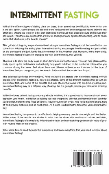 If you’ve always wanted to lose weight and increase your mental clarity but feel like no diet seems to fit you, then keep reading... Are you sick and tired of not being able to have the body you know you can have? Have you tried endless diets but nothing seems to work for more than a few weeks? Do you finally want to say goodbye to excess body fat and discover something which works for you? If so, then you’ve come to the right place. You see, burning fat doesn’t have to be difficult. Even if you’ve tried many fat burning diets and workout plans. In fact, it’s easier than you think. Health researchers from the University of Florida reported that intermittent fasting can be a reliable means of weight loss and may optimize physiological functioning, enhance performance and slow down aging. The report also suggested that fat burning starts after only 8-12 hours. Which means you can burn fat and increase your overall health without starving yourself or giving up all your favorite foods. Here’s just a tiny fraction of what you’ll discover: The truth about intermittent fasting and why is it so effective The history of fasting and why it isn’t as new or radical of an idea as you may have thought How intermittent fasting could help fight off cancer, excess weight, belly fat, and diabetes How to activate the process of autophagy and clean out the body 5 ways to reduce inflammation 6 effective ways to lower your cholesterol 7 risk factors that can lead to cardiovascular disease and how to use intermittent fasting to reduce these risks What the research say about intermittent fasting 8 possible side effects of an intermittent fast you need to know Men vs. women – why women should fast differently than men Keeping the fast: what is allowed when you're fasting? The different methods you can follow and still get the same results with this fasting How to implement exercise into your fast to get even better results How to measure your results with fasting How to troubleshoot your fast if you aren’t getting the results that you want How to lose body fat while increasing muscle mass compared to regular dieting And so much more Take a second to imagine how you’ll feel once you achieve the health you desire, and how your family and friends will react when they notice your new body and mental sharpness. So even if you’ve tried endless diets, you can burn fat and increase mental clarity with intermittent fasting. So if you have a burning desire to improve your physical and mental health, then scroll up and click "add to cart"!