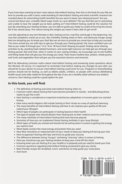 If you have been wanting to learn more about intermittent fasting, then this is the book for you! We are here to provide you with a basic understanding of intermittent fasting and what scientific research has revealed about its astonishing health benefits! Do you want to lower your blood pressure? Are you concerned about your unstable blood sugar levels as a pre-diabetic? Do you feel like you're overeating and unable to lose the weight you've been putting on? Intermittent fasting could be the solution for you! By extending your fasting window, you are able to guide your body to a path of burning the excess fat it has stored away. This means losing the weight you haven't been able to get rid of! Just like adjusting to any new lifestyle or diet, fasting can be a sacrifice and tough in the beginning. You may feel symptoms sneak up on you, like irritability, feeling weak or faint, and obviously hunger pangs that are tempting you to break your fast! But we are here to provide you some tips to help you succeed. The more armed you are with tips to get you through your fasting period, the more confident you can feel as you make it through your 12 or 16 or 18 hours fast! Staying occupied, finding some relaxing activities to do, avoiding food-related functions, and some light exercise can help get you through your fasting period. Not only that, when it comes to your eating window, we encourage you to eat healthy and filling foods that will give you the energy you need. That means healthy fast, protein, whole grains, and fruits and vegetables that will give you the essential vitamins and minerals. We'll be debunking common myths about intermittent fasting and answering some questions about the lifestyle. Of course, it's important to remember that before making any changes to your diet, you should be to your doctor to ensure intermittent fasting could work for you. Pregnant or breastfeeding women should not be fasting, as well as elderly adults, children, or people with serious debilitating health issues who take medicine throughout the day. If you are a healthy adult without any medical concerns, then fasting could be a great option for you!
