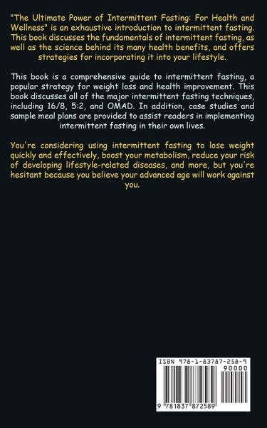 "The Ultimate Power of Intermittent Fasting: For Health and Wellness" is an exhaustive introduction to intermittent fasting. This book discusses the fundamentals of intermittent fasting, as well as the science behind its many health benefits, and offers strategies for incorporating it into your lifestyle. This book is a comprehensive guide to intermittent fasting, a popular strategy for weight loss and health improvement. This book discusses all of the major intermittent fasting techniques, including 16/8, 5:2, and OMAD. In addition, case studies and sample meal plans are provided to assist readers in implementing intermittent fasting in their own lives. You're considering using intermittent fasting to lose weight quickly and effectively, boost your metabolism, reduce your risk of developing lifestyle-related diseases, and more, but you're hesitant because you believe your advanced age will work against you.