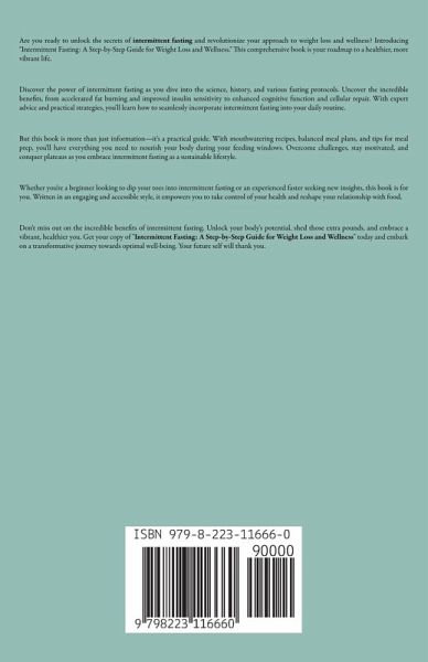 Are you ready to unlock the secrets of intermittent fasting and revolutionize your approach to weight loss and wellness? Introducing "Intermittent Fasting: A Step-by-Step Guide for Weight Loss and Wellness." This comprehensive book is your roadmap to a healthier, more vibrant life. Discover the power of intermittent fasting as you dive into the science, history, and various fasting protocols. Uncover the incredible benefits, from accelerated fat burning and improved insulin sensitivity to enhanced cognitive function and cellular repair. With expert advice and practical strategies, you'll learn how to seamlessly incorporate intermittent fasting into your daily routine. But this book is more than just information—it's a practical guide. With mouthwatering recipes, balanced meal plans, and tips for meal prep, you'll have everything you need to nourish your body during your feeding windows. Overcome challenges, stay motivated, and conquer plateaus as you embrace intermittent fasting as a sustainable lifestyle. Whether you're a beginner looking to dip your toes into intermittent fasting or an experienced faster seeking new insights, this book is for you. Written in an engaging and accessible style, it empowers you to take control of your health and reshape your relationship with food. Don't miss out on the incredible benefits of intermittent fasting. Unlock your body's potential, shed those extra pounds, and embrace a vibrant, healthier you. Get your copy of "Intermittent Fasting: A Step-by-Step Guide for Weight Loss and Wellness" today and embark on a transformative journey towards optimal well-being. Your future self will thank you.