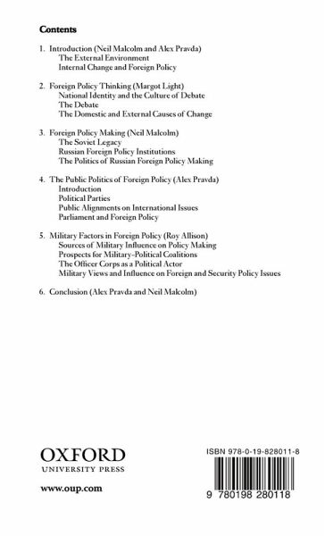After the turmoil following the collapse of Soviet power, post-Communist Russia has emerged as an assertively independent force in international affairs. Meanwhile, an intense debate has been underway in Moscow about Russia's national interests and foreign policy priorities. Domestic political conflicts and the close ties with former Soviet partner states have made internal factors particularly particularly important in shaping Russian foreign policy. Internal Factors in Russian Foreign Policy is the first systematic analysis of the domestic political forces which condition the international behaviour of the new Russian state. Four leading specialists examine in turn the areas of foreign policy thinking and debate, how policy is made, the public politics of foreign policy and the role of the military. They explore the changing domestic alignments associated with recent shifts in Russian foreign policy, focusing on the roles played by institutions such as the Security Council and the legislature, by military groupings and by emerging economic interests. The authors throw new light on the domestic foundations of Moscow's more assertive and sef-reliant stance.