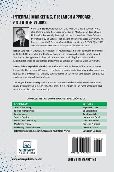 Christian Grönroos is EMERITUS Professor of Service and Relationship Marketing at Hanken School of Economics, Finland. He is initiator and Past Chair of the Board of the research and knowledge center, Centre for Relationship Marketing and Service Management (CERS), of this business university. He holds a Honorary Docorate at Åbo Akademi University, Finland.