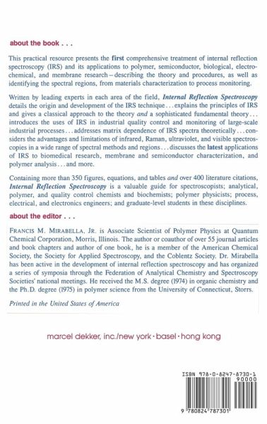Preface Contributors 1. History of Internal Reflection Spectroscopy 2. Principles Theory and Practice of Internal Reflection Spectroscopy 3. The Industrial Applications of Infrared Internal Reflection Spectroscopy 4. Process Monitoring Applications of Multiple Internal Reflection Spectroscopy 5. Biological Applications of Attenuated Total Reflection (ATR) Spectroscopy 6. The Determination of Molecular Spatial Orientation 7. Spectral Regions and Special Applications of Internal Reflection Spectroscopy 8. Studies of Semiconductor Surfaces: Vibrational Spectroscopy of Adsorbates 9. Electrochemical Applications of Internal Reflection Spectroscopy 10. In Situ Infrared Attenuated Total Reflection Membrane Spectroscopy 11. Determination of Optical Constants 12. Matrix Dependence in Single and Multilayer IRS Spectra Index