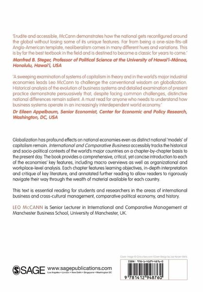 'Erudite and accessible, McCann demonstrates how the national gets reconfigured around the global without losing some of its unique features. Far from being a one-size-fits-all Anglo-American template, neoliberalism comes in many different hues and variations. This is by far the best textbook in the field and is destined to become a classic for years to come.' Manfred B. Steger, Professor of Political Science at the University of Hawai'i-Manoa, Honolulu, Hawai'i, USA 'A sweeping examination of systems of capitalism in theory and in the world's major industrial economies leads Leo McCann to challenge the conventional wisdom on globalization. Historical analysis of the evolution of business systems and detailed examination of present practice demonstrate persuasively that, despite facing common challenges, distinctive national differences remain salient. A must read for anyone who needs to understand how business systems operate in an increasingly interdependent world economy.' - Dr Eileen Appelbaum, Senior Economist, Center for Economic and Policy Research, Washington, DC, USA Globalization has profound effects on national economies even as distinct national 'models' of capitalism remain. International and Comparative Business accessibly tracks the historical and socio-political contexts of the world's major countries on a chapter-by-chapter basis to the present day. The book provides a comprehensive, critical, yet concise introduction to each of the economies' key features, including macro overviews as well as organizational and workplace-level analysis. Each chapter features learning objectives, in-depth interpretation and critique of key literature, and annotated further reading to allow readers to rigorously navigate their way through the wealth of material available for each country. This text is essential reading for students and researchers in the areas of international business and cross-cultural management, comparative political economy, and history. Leo McCann is Senior Lecturer in International and Comparative Management at Manchester Business School, University of Manchester, UK