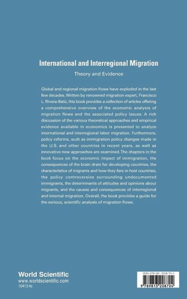 Global and regional migration flows have exploded in the last few decades. Written by renowned migration expert, Francisco L Rivera-Batiz, this book provides a collection of articles offering a comprehensive overview of the economic analysis of migration flows and the associated policy issues. A rich discussion of the various theoretical approaches and empirical evidence available in economics is presented to analyze international and interregional labor migration. Furthermore, policy reforms, such as immigration policy changes made in the US and other countries in recent years, as well as innovative new approaches are examined. The chapters in the book focus on the economic impact of immigration, the consequences of the brain drain for developing countries, the characteristics of migrants and how they fare in host countries, the policy controversies surrounding undocumented immigrants, the determinants of attitudes and opinions about migrants, and the causes and consequences of interregional and internal migration. Overall, the book provides a guide for the serious, scientific analysis of migration flows.