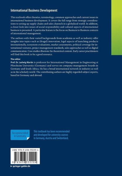 This textbook offers theories, terminology, common approaches and current issues in international business development. It covers the full range from strategic considerations to setting up supply chains and sales channels in a globalized world. In addition, a closer look into issues of social responsibility and cultural aspects of international business is presented. A particular feature is the focus on Business to Business contexts of international management.