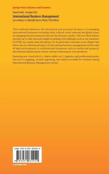 This textbook addresses the theoretical and practical dynamics of managing international businesses including multi-cultural, multi-national and global issues of managing business expansion beyond the domestic market. This new third edition provides up-to-date data and insights in dealing with challenges such as war, pandemic (COVID-19), supply chain disruption, etc. In particular, it includes a new chapter that delves into an institutional aspect of international business management and the roles of legal environments in multinational businesses such as intellectual property, international alliance/joint venture contract enforcement, and operations.