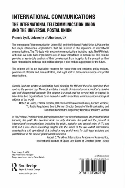 '...provides excellent background material... the book meets its main goal admirably, which is to provide the reader with a historical perspective and discussion of the two oldest international institutions in the modern world that have helped organise modern communications.' Telecommunications Policy 'Francis Lyall has written a fascinating book detailing the ITU and the UPU right from their roots to the present day. The book contains a wealth of information as a result of extensive and well documented research. This volume is a must read for anyone with an interest in how these two organizations have evolved in order to facilitate communications among all citizens of the world.' Robert W. Jones, Former Director , ITU Radiocommunication Bureau, Former Member, ITU Radio Regulations Board, Former Director General of the Broadcasting and Radiocommunications Regulatory Branch of Industry, Canada 'In his Preface, Professor Lyall aptly observes that "you do not understand the present without knowing the past". His excellent book not only describes the past and the present of international communications, including the origin, evolution and current roles of ITU and UPU, but it also offers interesting insights into the future of the two oldest international organizations still operational. It is indeed a very useful work for both legal scholars and practitioners in the area of global communications.' Andrei D. Terekhov, International Academy of Astronautics, International Institute of Space Law Board of Directors (1994-2006)