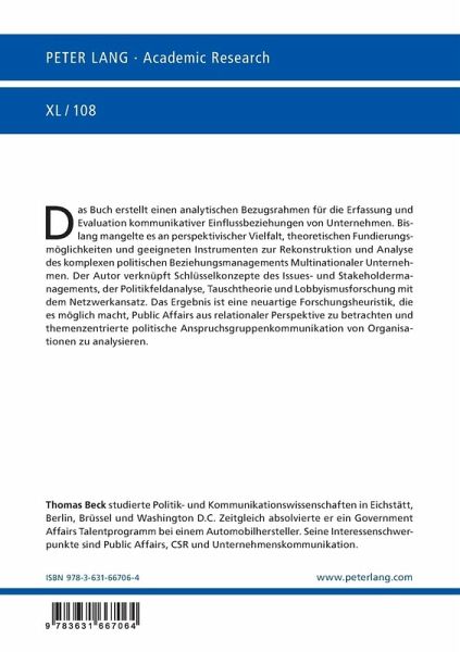 Das Buch erstellt einen analytischen Bezugsrahmen für die Erfassung und Evaluation kommunikativer Einflussbeziehungen von Unternehmen. Bislang mangelte es an perspektivischer Vielfalt, theoretischen Fundierungsmöglichkeiten und geeigneten Instrumenten zur Rekonstruktion und Analyse des komplexen politischen Beziehungsmanagements Multinationaler Unternehmen. Der Autor verknüpft Schlüsselkonzepte des Issues- und Stakeholdermanagements, der Politikfeldanalyse, Tauschtheorie und Lobbyismusforschung mit dem Netzwerkansatz. Das Ergebnis ist eine neuartige Forschungsheuristik, die es möglich macht, Public Affairs aus relationaler Perspektive zu betrachten und themenzentrierte politische Anspruchsgruppenkommunikation von Organisationen zu analysieren.