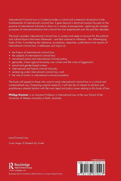 International Criminal Law in Context provides a critical and contextual introduction to the fundamentals of international criminal law. It goes beyond a doctrinal analysis focused on the practice of international tribunals to draw on a variety of perspectives, capturing the complex processes of internationalisation that criminal law has experienced over the past few decades. The book considers international criminal law in context and seeks to account for the political and cultural factors that have influenced - and that continue to influence - this still-emerging body of law. Considering the substance, procedures, objectives, justifications and impacts of international criminal law, it addresses such topics as: ¿ the history of international criminal law; ¿ the subjects of international criminal law; ¿ transitional justice and international criminal justice; ¿ genocide, crimes against humanity, war crimes and the crime of aggression; ¿ sexual and gender-based crimes; ¿ international and hybrid criminal tribunals; ¿ sentencing under international criminal law; and ¿ the role of victims in international criminal procedure. The book will appeal to those who want to study international criminal law in a critical and contextualised way. Presenting original research, it will also be of interest to scholars and practitioners already familiar with the main legal and policy issues relating to this body of law.