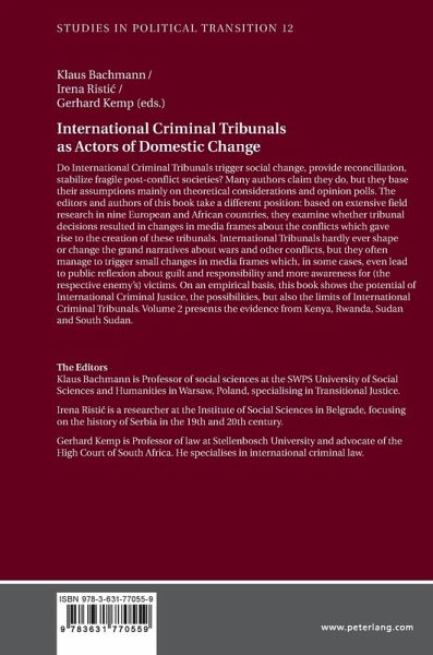 Do International Criminal Tribunals trigger social change, provide reconciliation, stabilize fragile post-conflict societies? Many authors claim they do, but they base their assumptions mainly on theoretical considerations and opinion polls. The editors and authors of this book take a different position: based on extensive field research in nine European and African countries, they examine whether tribunal decisions resulted in changes in media frames about the conflicts which gave rise to the creation of these tribunals. International Tribunals hardly ever shape or change the grand narratives about wars and other conflicts, but they often manage to trigger small changes in media frames which, in some cases, even lead to public reflexion about guilt and responsibility and more awareness for (the respective enemy's) victims. On an empirical basis, this book shows the potential of International Criminal Justice, the possibilities, but also the limits of International Criminal Tribunals. Volume 2 presents the evidence from Kenya, Rwanda, Sudan and South Sudan.