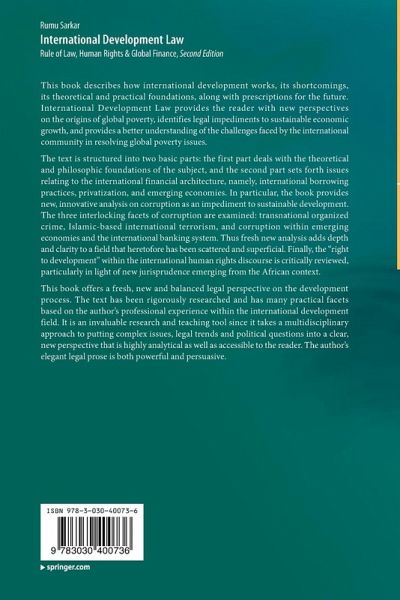 This book describes how international development works, its shortcomings, its theoretical and practical foundations, along with prescriptions for the future. International Development Law provides the reader with new perspectives on the origins of global poverty, identifies legal impediments to sustainable economic growth, and provides a better understanding of the challenges faced by the international community in resolving global poverty issues. The text is structured into two basic parts: the first part deals with the theoretical and philosophic foundations of the subject, and the second part sets forth issues relating to the international financial architecture, namely, international borrowing practices, privatization, and emerging economies. In particular, the book provides new, innovative analysis on corruption as an impediment to sustainable development. The three interlocking facets of corruption are examined: transnational organized crime, Islamic-based international terrorism, and corruption within emerging economies and the international banking system. Thus fresh new analysis adds depth and clarity to a field that heretofore has been scattered and superficial. Finally, the "right to development" within the international human rights discourse is critically reviewed, particularly in light of new jurisprudence emerging from the African context.This book offers a fresh, new and balanced legal perspective on the development process. The text has been rigorously researched and has many practical facets based on the author's professional experience within the international development field. It is an invaluable research and teaching tool since it takes a multidisciplinary approach to putting complex issues, legal trends and political questions into a clear, new perspective that is highly analytical as well as accessible to the reader. The author's elegant legal prose is both powerful and persuasive.