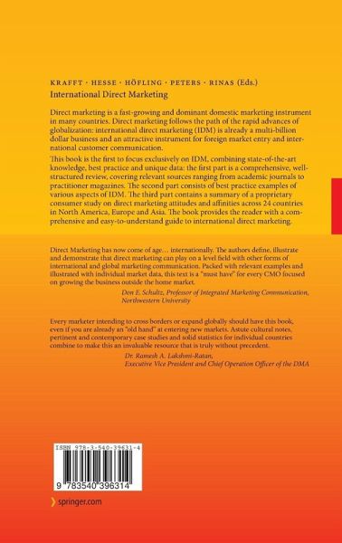 This book is the first to focus exclusively on IDM, combining state-of-the-art knowledge, best practice and unique data: The first part is a comprehensive, well-structured review, covering relevant sources ranging from academic journals to practitioner magazines. The second part consists of best practice examples of various aspects of IDM. The third part contains a summary of a proprietary consumer study on direct marketing attitudes and affinities across 24 countries in North America, Europe and Asia. The book provides the reader with a comprehensive and easy-to-understand guide to international direct marketing.