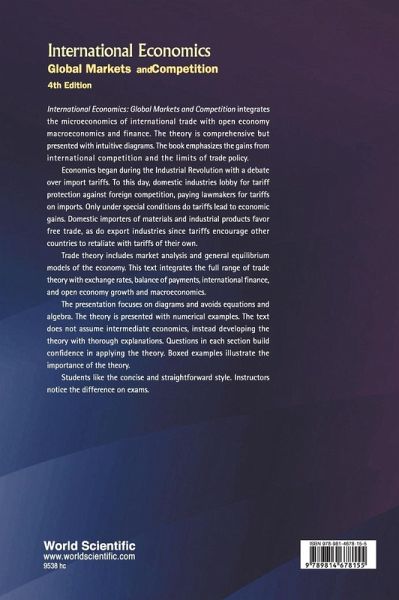 International Economics: Global Markets and Competition integrates the microeconomics of international trade with open economy macroeconomics and finance. The theory is comprehensive but presented with intuitive diagrams. The book emphasizes the gains from international competition and the limits of trade policy. Economics began during the Industrial Revolution with a debate over import tariffs. To this day, domestic industries lobby for tariff protection against foreign competition, paying lawmakers for tariffs on imports. Only under special conditions do tariffs lead to economic gains. Domestic importers of materials and industrial products favor free trade, as do export industries since tariffs encourage other countries to retaliate with tariffs of their own. Trade theory includes market analysis and general equilibrium models of the economy. This text integrates the full range of trade theory with exchange rates, balance of payments, international finance, and open economy growth and macroeconomics. The presentation focuses on diagrams and avoids equations and algebra. The theory is presented with numerical examples. The text does not assume intermediate economics, instead developing the theory with thorough explanations. Questions in each section build confidence in applying the theory. Boxed examples illustrate the importance of the theory. Students like the concise and straightforward style. Instructors notice the difference on exams.