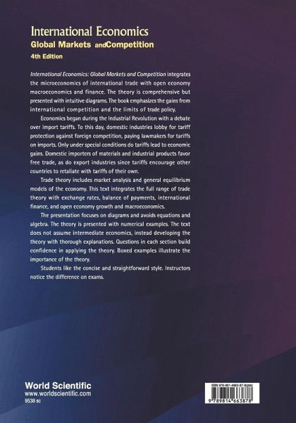 International Economics: Global Markets and Competition integrates the microeconomics of international trade with open economy macroeconomics and finance. The theory is comprehensive but presented with intuitive diagrams. The book emphasizes the gains from international competition and the limits of trade policy. Economics began during the Industrial Revolution with a debate over import tariffs. To this day, domestic industries lobby for tariff protection against foreign competition, paying lawmakers for tariffs on imports. Only under special conditions do tariffs lead to economic gains. Domestic importers of materials and industrial products favor free trade, as do export industries since tariffs encourage other countries to retaliate with tariffs of their own. Trade theory includes market analysis and general equilibrium models of the economy. This text integrates the full range of trade theory with exchange rates, balance of payments, international finance, and open economy growth and macroeconomics. The presentation focuses on diagrams and avoids equations and algebra. The theory is presented with numerical examples. The text does not assume intermediate economics, instead developing the theory with thorough explanations. Questions in each section build confidence in applying the theory. Boxed examples illustrate the importance of the theory. Students like the concise and straightforward style. Instructors notice the difference on exams.