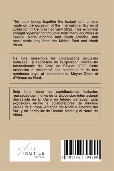 This book brings together the textual contributions made on the occasion of the International Surrealist Exhibition in Cairo in February 2022. This exhibition brought together contributors from many countries in Europe, North America and South America, and most particularly from the Middle East and North Africa. Edited by Mohsen Elbelasy ---------- Ce livre rassemble les contributions textuelles réalisées à l'occasion de l'Exposition Surréaliste Internationale du Caire de Février 2022. Cette exposition a rassemblé des contributeurs de très nombreux pays, d'Europe, d'Amérique du Nord et d'Amérique du Sud, et notamment du Moyen Orient et d'Afrique du Nord. ---------- Este libro reúne las contribuciones textuales realizadas con motivo de la Exposición Internacional Surrealista en El Cairo en febrero de 2022. Esta exposición reunió a colaboradores de muchos países de Europa, América del Norte y América del Sur, y en particular de Oriente Medio y el Norte de África.