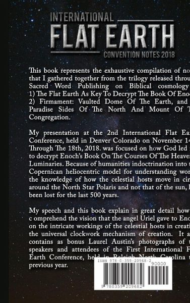 This book represents the exhaustive compilation of notes that I gathered together from my flat earth trilogy to create my presentation at the 2nd International Flat Earth Conference, held in Denver Colorado, November 14th Through The 18th, 2018. The speech was focused on how God led me to decrypt Enoch's Book On The Courses Of The Heavenly Luminaries. Because of humanities indoctrination into the Copernican heliocentric model for understanding world, the knowledge of how the celestial hosts move in circle around the North Star Polaris and not that of the sun, has been lost for the last 500 years. My speech and this book explain in great detail how to comprehend the vision that the angel Uriel gave to Enoch on the intricate workings of the celestial hosts in creating the universal clockwork mechanism of creation. It also contains as bonus Laurel Austin's photographs of the speakers and attendees of the First International Flat Earth Conference, held in Raleigh North Carolina the previous year