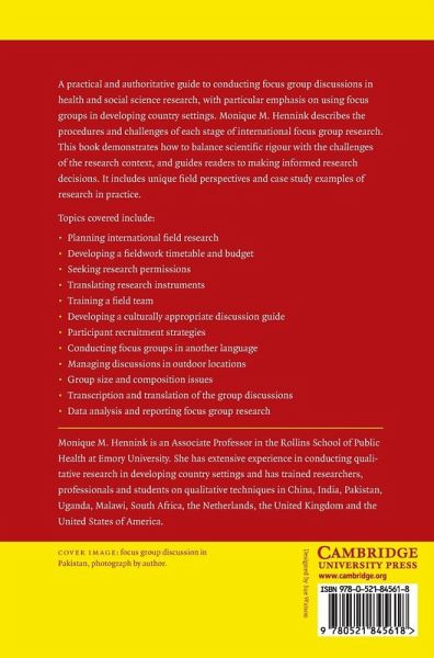 A practical and authoritative guide to conducting focus group discussions in health and social science research, with particular emphasis on using focus groups in developing country settings. Monique M. Hennink describes the procedures and challenges of each stage of international focus group research. This book demonstrates how to balance scientific rigour with the challenges of the research context, and guides readers to make informed research decisions. It includes unique field perspectives and case study examples of research in practice. Topics covered include: planning international field research; developing a fieldwork timetable and budget; seeking research permissions; translating research instruments; training a field team; developing a culturally appropriate discussion guide; participant recruitment strategies; conducting focus groups in another language; managing discussions in outdoor locations; group size and composition issues; transcription and translation of the group discussions; data analysis and reporting focus group research.