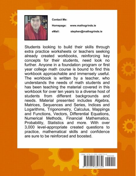 Students looking to build their skills through extra practice worksheets or teachers seeking already-created workbooks, reinforcing key concepts for their students, need look no further. Anyone in a foundation program or first year-college math course is bound to find this workbook approachable and immensely useful.The workbook is written by a teacher, who understands the needs of math students and has been teaching the material covered in this workbook for over five years to a diverse host of students from different backgrounds and needs. Material presented includes Linear Equations and Matrices, Quadratic and Cubic Equations, Sequences and Series, Indices and Logarithms, Trigonometry, Differentiation, and Integration. With over 2,000 level-appropriate created questions to practice, mathematical skills and confidence are sure to be reinforced and boosted.