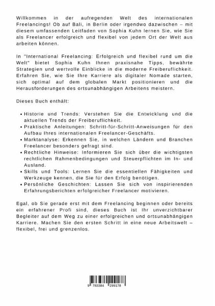 Willkommen in der aufregenden Welt des internationalen Freelancings! Ob auf Bali, in Berlin oder irgendwo dazwischen - mit diesem umfassenden Leitfaden von Sophia Kuhn lernen Sie, wie Sie als Freelancer erfolgreich und flexibel von jedem Ort der Welt aus arbeiten können.In "International Freelancing: Erfolgreich und flexibel rund um die Welt" bietet Sophia Kuhn Ihnen praxisnahe Tipps, bewährte Strategien und wertvolle Einblicke in die moderne Freiberuflichkeit. Erfahren Sie, wie Sie Ihre Karriere als digitaler Nomade starten, sich optimal auf dem globalen Markt positionieren und die Herausforderungen des ortsunabhängigen Arbeitens meistern.Dieses Buch enthält:Historie und Trends: Verstehen Sie die Entwicklung und die aktuellen Trends der Freiberuflichkeit.Praktische Anleitungen: Schritt-für-Schritt-Anweisungen für den Aufbau Ihres internationalen Freelancer-Geschäfts.Marktanalyse: Erkennen Sie, in welchen Ländern und Branchen Freelancer besonders gefragt sind.Rechtliche Hinweise:Informieren Sie sich über die wichtigsten rechtlichen Rahmenbedingungen und Steuerpflichten im In- und Ausland.Skills und Tools: Lernen Sie die essentiellen Fähigkeiten und Werkzeuge kennen, die Sie für den Erfolg benötigen.Persönliche Geschichten: Lassen Sie sich von inspirierenden Erfahrungsberichten erfolgreicher Freelancer motivieren.Egal, ob Sie gerade erst mit dem Freelancing beginnen oder bereits ein erfahrener Profi sind, dieses Buch ist Ihr unverzichtbarer Begleiter auf dem Weg zu einer erfolgreichen und ortsunabhängigen Karriere. Machen Sie den ersten Schritt in eine neue Arbeitswelt - flexibel, frei und grenzenlos.