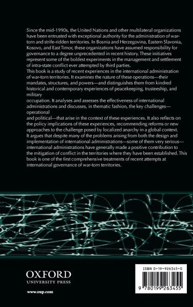 Since the mid-1990s the United Nations and other multilateral organizations have been entrusted with exceptional authority for the administration of war-torn and strife-ridden territories. In Bosnia and Herzegovina, Eastern Slavonia, Kosovo, and East Timor these organizations have assumed responsibility for governance to a degree unprecedented in recent history. These initiatives represent some of the boldest experiments in the management and settlement of intra-state conflict ever attempted by third parties. This book is a study of recent experiences in the international administration of war-torn territories. It examines the nature of these operations - their mandates, structures, and powers - and distinguishes them from kindred historical and contemporary experiences of peacekeeping, trusteeship, and military occupation. It analyses and assesses the effectiveness of international administrations and discusses, in thematic fashion, the key operational and political challenges that arise in the context of these experiences. It also reflects on the policy implications of these experiences, recommending reforms or new approaches to the challenge posed by localized anarchy in a global context. It argues that, despite many of the problems arising from both the design and implementation of international administrations, international administration has generally made a positive contribution to the mitigation of conflict in the territories where they have been established. This major new work from a leading scholar provides a comprehensive treatment of recent attempts at international governance of war-torn territories, and will be essential reading for anyone interested in peace-keeping operations and international administration.