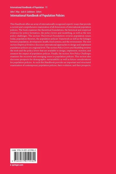 Part 1. Theoretical Foundations.- 1. Contemporary Population Issues (Jack A. Goldstone and John F. May).- 2. Population Policies Framework (Karen Hardee).- 3. Classical Foundations of Past and Present Population Policies (Yves Charbit).- 4. Population, Burden of Disease, and Health Services (Vincent Turbat, Rebecca Gribble, and Wu Zeng).- 5. Population, Development, and Policy (John Bongaarts, Michele Gragnolati, S. Amer Ahmed, and Jamaica Corker).- 6. Population Dynamics and the Environment: The Demo-climatic Transition (Alisson Flávio Barbieri and William K. Pan).- 7. Population and Food System Sustainability (George Mergos).- Part 2. Empirical Evidence.- 8. Sub-Saharan Africa: Slow Fertility Transitions Despite Policy Efforts (Aristide Romaric Bado, Jean-Pierre Guengant, and Hamidou Issaka Maga).- 9. The United States and Canada: Demographic Realities and Policy Responses (Kaja Jurczynska and Jay Gribble).- 10. Population Policies in Latin American and the Caribbean: From CarmenMiró to the Montevideo Consensus (Jose Miguel Guzman).- 11. Demographic Features of West Asian and North African Countries: The Impact of Population Policies (Mehtab S. Karim, Elena Ambrosetti, and Zahia Ouadah-Bedidi).- 12. South Asia: Did Population Policies Trigger a Fertility Convergence? (Leela Visaria).- 13. Population Policies in East Asia and Oceania (Stuart Gietel-Basten, Christian Joy Pattawi Cruz, Rachel Ganly, Zilin Li, and Jason Tsz Him Cheung).- 14. Europe: Low Fertility, Aging, and Migration Policies (Elena Ambrosetti).- 15. Population Institutions and International Population Conferences (Stan Bernstein, Karen Hardee, John F. May, and Marianne Haslegrave).- Part 3. Policy Levers and Modelling.- 16. Data Collection for Population Policies (Thomas Spoorenberg).- 17. Family Policies: How do they Differ around the World? (Katharina Wesolowski and Sunnee Billingsley).- 18. Population and Health Policies in Urban Areas (Myriam Vuckovic and Alayne Adams).- 19. Policies Neededto Capture Demographic Dividends (Vincent Turbat).- 20. Linkages Between Family Planning and HIV/AIDS Programs (Rachel Sullivan Robinson).- 21. Population Projections and Population Policies (Thomas Buettner).- 22. Population Policy Models (R. Scott Moreland).- 23. Funding of Population Policies and Programs (Arin Dutta, Kevin Ward, and Suneeta Sharma).- 24. Measuring the Effectiveness, Efficiency, and Impact of Population Policies (Michele Tarsilla).- Part 4. New Policy Challenges.- 25. Population Aging and Public Policy (Stipica Mudrazija and Jacqueline L. Angel).- 26. Pension Policies (John Turner).- 27. The Contraceptive Revolution (John Cleland).- 28. The Role of Abortion in Population Policies (Barbara Crane and Emily A. Maistrellis).- 29. International Migration Policies (Susan K. Brown).- 30. The Education Revolution (Anne Goujon).- 31. Priority Groups in Population Policies (Sara Rotenberg).- 32. Demographic Dynamics, Poverty, and Inequality (Jorge A. Paz).- 33. Bioethics, SexSelection, and Gender Equity (Laura Rahm).- 34. Population and National Security (Jennifer D. Sciubba and Seongjoon Hwang).- 35. Demographic Sustainability (Toshihiko Hara).- 36. Prospects for Population Policies and Interventions (John F. May and Jack A. Goldstone).- General Conclusion (Jack A. Goldstone and John F. May).