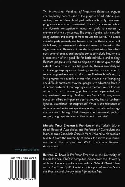 Contents: Bertram C. Bruce/Mustafa Yunus Eryaman: The Progressive Impulse in Education - John L. Pecore: Past - John L. Pecore: Aims of Progressive Education - Wayne J. Urban: Anti-Progressivism in Education: Past and Present - Selçuk Uygun: John Dewey and Village Institute Model in Teacher Training System in Turkey - Leonard J. Waks: John Dewey and the Challenge of Progressive Education - George E. Hein: Austrian School Reform, 1919-1934 - Anna Brix Thomsen: Revamping the French Educational Philosopher Célestin Freinet's Pedagogy and its Relevance for Current Discussions on Progressive Education - Rhonda K. Webb/Chara Haeussler Bohan: The Progressive Pedagogies of Ella Flagg Young, Lucy Sprague Mitchell, Lucy Maynard Salmon and Anna Julia Cooper: Beyond Jane Addams - John L. Pecore: From Kilpatrick's Project Method to Project-Based Learning - C. Gregg Jorgensen: Discovering Dewey as a Guiding Foundation: Examining Moral Problems Using Issues-Centered Education - Walter Feinberg/Jeanne Connell: Saving a Progressive Vision: Assessing the Move of the Barnes Foundation - Fred Burton: Where's Wonder? - Brian Drayton: Present: Within Institutions - Brian Drayton: Interrogating and Reconstructing Practice - Carol Mutch: Education in New Zealand: A Revered Past, a Contested Present, and an Uncertain Future - George E. Hein: Progressive Museum Education: Examples From the 1960s - Amanda R. Morales/Jory Samkoff: The Teacher-Artist's Creed: Teaching as a Human, Artistic, and Moral Act - Susan Matoba Adler/Jeanne Marie Iorio: Progressive Teachers of Young Children: Creating Contemporary Agents of Change - Susanne Gannon/Wayne Sawyer: Literacy, Literature, and Moral Panic in Australia - Max A. Hope: Developing Active Citizenship in Schools: A Case Study of Democracy in Practice - Bronwyn Elisabeth Wood: Teacher Interpretations of «Active» Citizenship Curricula: Shared Identities and Spatial Orientations - Ching-Chiu Lin/Melody Milbrandt/Karen Hutzel/Bill Blidy: The Unfinished and Ongoing Business of Art Education in the U.S.: Collaboration, Participation, and Democratic Practices - Leslie Boedicker: Progressive Education as Continuing Education for the Developmentally Disabled - Jeanne Connell/Alistair Ross: Present - Jeanne Connell/Alistair Ross: Participation and Citizenship - Leo Casey: Participation as Telos for Learning - Chaebong Nam: Technology as Connected and Critical Learning Practice - Bertram C. Bruce: What Jane Addams Tells Us About Early Childhood Education - Ana Bela Ribeiro/Mariana Rodrigues/Andreia Caetano/Sofia C. Pais/Isabel Menezes: Citizenship Education in European Schools: The Critical Vision of NGOs - Delwyn L. Harnisch/Timothy C. Guetterman: Progressive Education in Georgia: Advances in Professional Development of Learning Communities - Shreya Ghosh: Activating Citizenship: The Use of Education to Create Notions of Identity and Citizenship in South Asia - Joseph Chow: Towards a Framework for Understanding Adolescents' Civic Competency - Maureen Hogan: Future - Maureen Hogan: Future of Progressive Education - Kyle Arvid Greenwalt/Laura A. Edwards: The Great Commonwealth of Successive Generations: Progressive Education in an Era of Global Change - Jiacheng Li/Jing Chen: The Banzhuren: Classrooming as Democracy in China - Teuku Zulfikar: Indonesian Education: Its Efforts for Progressive Learning Environment - Iván M. Jorrín Abellán/Sara Villagrá Sobrino/Sara García Sastre: The Rural-Urban Paradox in Primary Schools: 140 Years of Progressive Education in Spain - Steven Jay Gross/Joan Poliner: The New DEEL (Democratic Ethical Educational Leadership): Transformative, Progressive Educational Administration - Sally J. W. Read: Stories of Progressive Education in the 21st Century - Martina Riedler: Overarching Issues of Progressive Education - Henry Giroux: Reclaiming the Radical Imagination: Challenging Casino Capitalism's Punishing Factories - Lilia D. Monzó/Peter McLaren: The Future is Marx: Bringing Back Class and Changing the World: Revolutionary Critical Pedagogy as Moral Imperative - Valerie Scatamburlo-D'Annibale: Beyond «Discourse Radicalism»: Revolutionary Critical Pedagogy and the Struggle for Social Justice - Juha Suoranta: Progressive Critical Pedagogies and the Idea of Communism - Maureen P. Hogan/Jeanne Connell: Hull-House as a Queer Counterpublic - Carol Gilles: Whole Language Philosophy and Practice: Where Have We Been and Where Are We Headed - Mary M. Kitagawa/Chisato Kitagawa: Core Values of Progressive Education: Seikatsu Tsuzurikata and Whole Language - Saville Kushner: Lawrence Stenhouse and the Refutation of Progressivism in Curriculum - Bertram C. Bruce: Coffee Cups, Frogs, and Lived Experience - Samuel Day Fassbinder: Ecopedagogy and Progressive Education