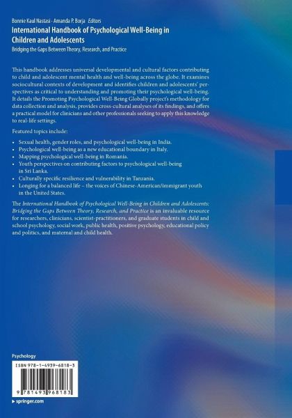 The International Handbook of Psychological Well-Being in Children and Adolescents: Bridging the Gaps Between Theory, Research, and Practice is an invaluable resources for researchers, clinicians, scientist-practitioners, and graduate students in child and school psychology, social work, public health, positive psychology, educational policy and politics, and maternal and child health.