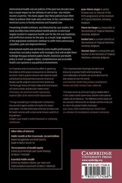 International health and aid policies of the past two decades have had a major impact on the delivery of care in low and middle-income countries. This book argues that these policies have often failed to achieve their main aims, and have in fact contributed to restricted access to family medicine and hospital care. Presenting detailed evidence, and illustrated by case studies, this book describes how international health policies to date have largely resulted in expensive health care for the rich, and disjointed and ineffective services for the poor. As a result, large segments of the population world-wide continue to suffer from unnecessary casualties, pain and impoverishment. International Health and Aid Policies arms health professionals, researchers and policy makers with strategies that will enable them to bridge the gaps between public health, medicine and health policy in order to support robust, comprehensive and accessible health care systems in any political environment.