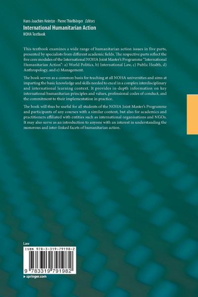 This textbook examines a wide range of humanitarian action issues in five parts, presented by specialists from different academic fields. The respective parts reflect the five core modules of the International NOHA Joint Master's Programme "International Humanitarian Action": a) World Politics, b) International Law, c) Public Health, d) Anthropology, and e) Management. The book serves as a common basis for teaching at all NOHA universities and aims at imparting the basic knowledge and skills needed to excel in a complex interdisciplinary and international learning context. It provides in-depth information on key international humanitarian principles and values, professional codes of conduct, and the commitment to their implementation in practice. The book will thus be useful for all students of the NOHA Joint Master's Programme and participants of any courses with a similar content, but also for academics and practitioners affiliated with entities suchas international organisations and NGOs. It may also serve as an introduction to anyone with an interest in understanding the numerous and inter-linked facets of humanitarian action.