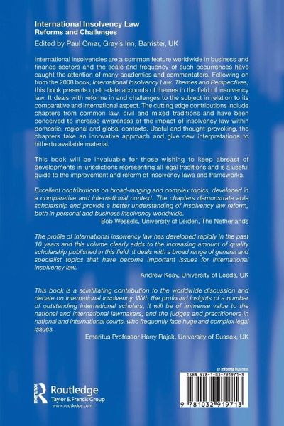 Contents: Editorial preface; Part I New Thoughts on Insolvency: Catholic social thought and corporate insolvency law, Armin J. Kammel; International trade and insolvency, Paul Todd. Part II The Law Reform Imperative: Tranched, squared and derived: credit derivative regulatory reform and the restructuring of insolvent businesses, Janis Sarra; China's new bankruptcy law: notable features and key enforcement issues, Rebecca Parry and Haizheng Zhang; Creating a template for banking insolvency law reform after the collapse of Northern Rock, Roman Tomasic. Part III Issues in Corporate Rescue: Aggrieved shareholders as creditors: an unmapped coordinate in the cartography of Australian insolvency law, Anil Hargovan; The Australian corporate rescue provisions: how do they compare?, David Morrison and Colin Anderson. Part IV Issues for Small and Medium Enterprises: The extension of small company voluntary arrangements: a response to the Conservative Party's corporate restructuring proposals, John Tribe. Part V Issues in Personal Insolvency: Perspectives on protecting the family home in South African insolvency law, Corlia van Heerden, André Boraine and Lienne Steyn; Debt enforcement regimes outside bankruptcy in English law: observations on current diversity and future complexity, David Milman. Part VI The UNCITRAL Projects: Representing the interests of unsecured creditors: a comparative look at UNCITRAL's legislative guide on insolvency law, Susan Block-Lieb, Juraj Alexander and Evgeny Kovalenko; Is the future bright for enterprise groups in insolvency? An analysis of UNCITRAL's new recommendations, Irit Mevorach; Beyond the UNCITRAL model law in Australasia: the scope for bilateral agreements, David Brown; Index.