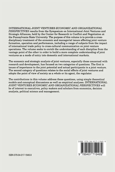 International Joint Ventures: Economic and Organizational Perspectives is the result of a symposium on International Joint Ventures and Strategic Alliances held by the Center for Research in Conflict and Negotiation at Pennsylvania State University. The book gives a cross-disciplinary treatment of the economic and managerial issues affecting joint venture formation, operation and performance, including subjects ranging from the impact of international trade policy to cross-cultural communication on joint venture operations. The volume enriches our understanding of each discipline from the vantage point of the other, building a more complete understanding of joint ventures as a mode of entry into domestic and international markets.