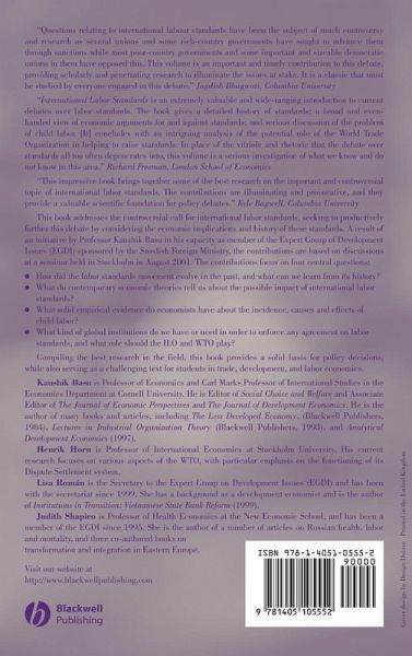 This book addresses the controversial call for international labor standards, seeking to productively further this debate by considering the economic implications and history of these standards. A result of an initiative by Professor Kaushik Basu in his capacity as member of the Expert Group of Development Issues (EGDI) sponsored by the Swedish Foreign Ministry, the contributions are based on discussions at a seminar held in Stockholm in August 2001. They focus on four central questions: * How did the labor standards movement evolve in the past, and what can we learn from its history? * What do contemporary economic theories tell us about the possible impact of international labor standards? * What solid empirical evidence do economists have about the incidence, causes and effects of child labor? * What kind of global institutions do we have or need in order to enforce any agreement on labor standards, and what role should the ILO and WTO play? Compiling the best research in the field, this book provides a solid basis for policy decisions, while also serving as a challenging text for students in trade, development, and labor economics.