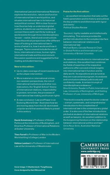 In this fully updated and revised edition, the authors explore the evolution, nature and function of international law in world politics and situate international law in its historical and political context. They propose three interdisciplinary 'lenses' (realist, liberal and constructivist) through which to view the role of international law in world politics and suggest that the concept of an international society provides the overall context within which international legal developments occur. These theoretical perspectives offer different ways of looking at international law in terms of what it is, how it works and how it changes. Topics covered include the use of force, international crimes, human rights, international trade and the environment. The new edition also contains more material on non-western perspectives, international institutions and non-state actors and a new bibliography. Each chapter features discussion questions and guides to further reading.