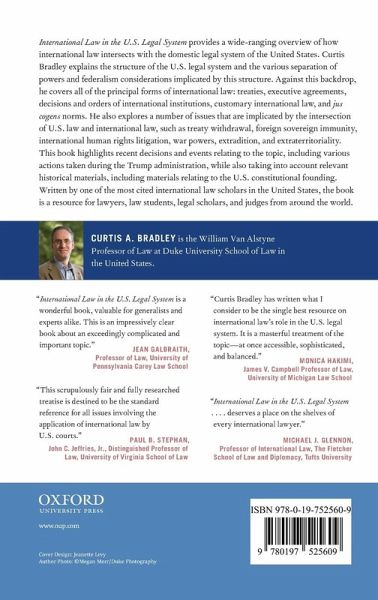 International Law in the U.S. Legal System provides a wide-ranging overview of how international law intersects with the domestic legal system of the United States, and points out various unresolved issues and areas of controversy. Curtis Bradley explains the structure of the U.S. legal system and the various separation of powers and federalism considerations implicated by this structure, especially as these considerations relate to the conduct of foreign affairs. Against this backdrop, he covers all of the principal forms of international law: treaties, executive agreements, decisions and orders of international institutions, customary international law, and jus cogens norms. He also explores a number of issues that are implicated by the intersection of U.S. law and international law, such as treaty withdrawal, foreign sovereign immunity, international human rights litigation, war powers, extradition, and extraterritoriality. This book highlights recent decisions and events relating to the topic, including various actions taken during the Trump administration, while also taking into account relevant historical materials, including materials relating to the U.S. Constitutional founding. Written by one of the most cited international law scholars in the United States, the book is a resource for lawyers, law students, legal scholars, and judges from around the world.