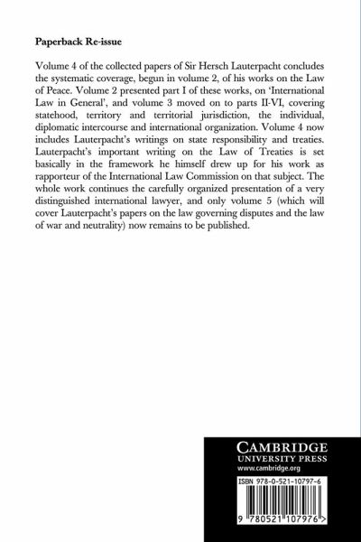 Volume 4 of the selected papers of Sir Hersch Lauterpacht concludes the systematic coverage, begun in volume 2, of his works on the Law of Peace. Volume 2 represented part I of these works on International Law in General and volume 3 moved on to parts II-VI covering statehood, territory and territorial jurisdiction, the individual, diplomatic intercourse and international organisation. Volume 4 now includes Lauterpacht's writings on state responsibility and treaties. Lauterpacht's important writing on the Law of Treaties is set basically in the framework he himself drew up from his work as rapporteur of the International Law Commission on that subject. The whole work continues the carefully organised presentation of a very distinguished international lawyer and only volume 5 now remains to be published.