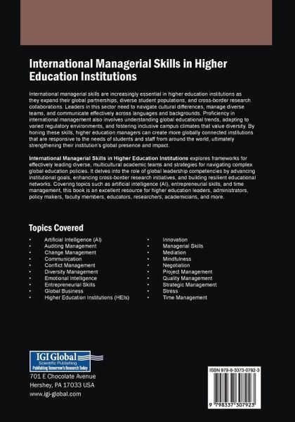 International managerial skills are increasingly essential in higher education institutions as they expand their global partnerships, diverse student populations, and cross-border research collaborations. Leaders in this sector need to navigate cultural differences, manage diverse teams, and communicate effectively across languages and backgrounds. Proficiency in international management also involves understanding global educational trends, adapting to varied regulatory environments, and fostering inclusive campus climates that value diversity. By honing these skills, higher education managers can create more globally connected institutions that are responsive to the needs of students and staff from around the world, ultimately strengthening their institution's global presence and impact. International Managerial Skills in Higher Education Institutions explores frameworks for effectively leading diverse, multicultural academic teams and strategies for navigating complex global education policies. It delves into the role of global leadership competencies by advancing institutional goals, enhancing cross-border research initiatives, and building resilient educational networks. Covering topics such as artificial intelligence (AI), entrepreneurial skills, and time management, this book is an excellent resource for higher education leaders, administrators, policy makers, faculty members, educators, researchers, academicians, and more.