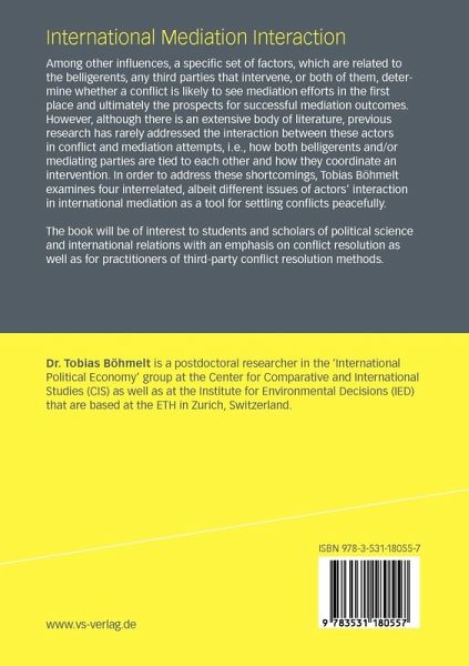 Among other influences, a specific set of factors, which are related to the belligerents, any third parties that intervene, or both of them, determine whether a conflict is likely to see mediation efforts in the first place and ultimately the prospects for successful mediation outcomes. However, although there is an extensive body of literature, previous research has rarely addressed the interaction between these actors in conflict and mediation attempts, i.e., how both belligerents and/or mediating parties are tied to each other and how they coordinate an intervention. In order to address these shortcomings, Tobias Böhmelt examines four interrelated, albeit different issues of actors' interaction in international mediation as a tool for settling conflicts peacefully.