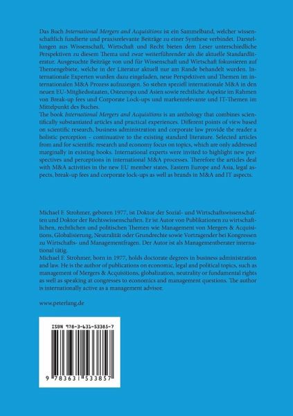 Das Buch International Mergers and Acquisitions ist ein Sammelband, welcher wissenschaftlich fundierte und praxisrelevante Beiträge zu einer Synthese verbindet. Darstellungen aus Wissenschaft, Wirtschaft und Recht bieten dem Leser unterschiedliche Perspektiven zu diesem Thema und zwar weiterführender als die aktuelle Standardliteratur. Ausgesuchte Beiträge von und für Wissenschaft und Wirtschaft fokussieren auf Themengebiete, welche in der Literatur aktuell nur am Rande behandelt wurden. Internationale Experten wurden dazu eingeladen, neue Perspektiven und Themen im internationalen M&A Prozess aufzuzeigen. So stehen speziell internationale M&A in den neuen EU-Mitgliedsstaaten, Osteuropa und Asien sowie rechtliche Aspekte im Rahmen von Break-up fees und Corporate Lock-ups und markenrelevante und IT-Themen im Mittelpunkt des Buches. The book International Mergers and Acquisitions is an anthology that combines scientifically substantiated articles and practical experiences to a synthesis. Different points of view based on scientific research, business administration and corporate law provide the reader a holistic perception - continuative to the existing standard literature. Selected articles from and for scientific research and economy focus on topics, which are only addressed marginally in existing books. International experts were invited to highlight new perspectives and perceptions in international M&A processes. Therefore the articles deal with M&A activities in the new EU member states, Eastern Europe and Asia, legal aspects, break-up fees and corporate lock-ups as well as brands in M&A and IT aspects.