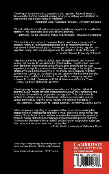 States have long been wary of putting international migration on the global agenda. As an issue that defines sovereignty - that is, who enters and remains on a state's territory - international migration has called for protection of national prerogatives and unilateral actions. However, since the end of World War I, governments have sought ways to address various aspects of international migration in a collaborative manner. This book examines how these efforts to increase international cooperation have evolved from the early twentieth century to the present. The scope encompasses all of the components of international migration: labor migration, family reunification, refugees, human trafficking and smuggling, and newly emerging forms of displacement (including movements likely to result from global climate change). The final chapter assesses the progress (and lack thereof) in developing an international migration regime and makes recommendations towards strengthening international cooperation in this area.