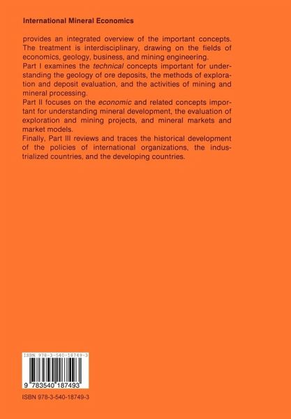 International Mineral Economics provides an integrated overview of the concepts important for mineral exploration, mine valuation, mineral market analysis, and international mineral policies. The treatment is interdisciplinary, drawing on the fields of economics, geology, business, and mining engineering. Part I, Economic Geology and Mineral Development, examines the technical concepts important for understanding the geology of ore deposits, the methods of exploration and deposit evaluation, and the activities of mining and mineral processing. Part II, Mineral Economics, focuses on the economic and related concepts important for understanding mineral development, the evaluation of exploration and mining projects, and mineral markets and market models. Finally, Part III, International Mineral Policies, reviews and traces the historical development of the policies of international organizations, the industrialized countries, and the developing countries.