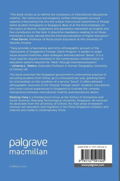 This book examines the Singapore government's controversial practice of recruiting students from China and granting them full scholarships on the condition of a service "bond". It offers detailed ethnographic accounts of the Chinese "foreign talent" students' educational and cross-cultural experiences in Singapore to illustrate the complex intersections between international mobility and educational desire. In doing so, the book presents contemporary Singapore society's concerns over immigration and cross-cultural encounters from a unique perspective.