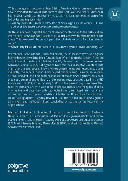 International news-agencies, such as Reuters, the Associated Press and Agence France-Presse, have long been 'unsung heroes' of the media sphere. From the mid-nineteenth century, in Britain, the US, France and, to a lesser extent, Germany, a small number of agencies have fed their respective countries with international news reports. They informed governments, businesses, media and, indirectly, the general public. They helped define 'news'. Drawing on years of archival research and first-hand experience of major news agencies, this book provides a comprehensive history of the leading news agencies based in the UK, France and the USA, from the early 1800s to the present day. It retraces their relations with one another, with competitors and clients, and the types of news, information and data they collected, edited and transmitted, via a variety of means, from carrier-pigeons to artificial intelligence. It examines the sometimes colourful biographies of agency newsmen, and the riseand fall of news agencies as markets and methods shifted, concluding by looking to the future of the organisations.
