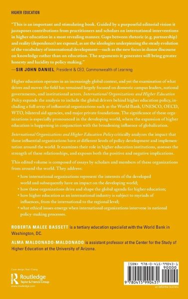 Higher Education operates in an increasingly global context, and yet the examination of what drives and moves the field has remained largely focused on domestic campus leaders, national governments and institutional actors. International Organizations and Higher Education Policy expands the analysis to include the global drivers behind higher education policy, including a full array of influential organizations such as the World Bank, UNESCO, OECD, WTO, bilateral aid agencies and major private foundations. The significance of these organizations is especially pronounced in the developing world, where the expansion of higher education is happening in conjunction with the broadening influence of globalization. International Organizations and Higher Education Policy critically analyses the impact that these influential organizations have at different levels of policy development and implementation around the world. It examines their role in higher education institutions, examines the strength of these relationships, and exposes both the positive and negative implications. This edited volume is composed of scholars and members of these organizations from around the world. They address: How international organizations represent the interests of the developed world and subsequently have an impact on the developing world. How these organizations drive and shape the global agenda for higher education How higher education as an international industry is subject to a myriad of influences, from the international to the regional level What ethical issues emerge when international organizations intervene in national policy-making processes.