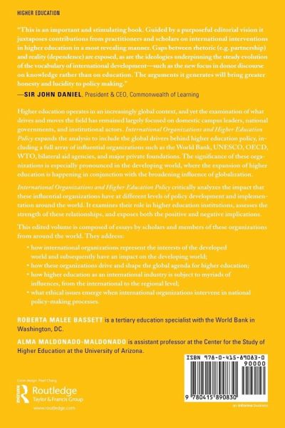 Higher Education operates in an increasingly global context, and yet the examination of what drives and moves the field has remained largely focused on domestic campus leaders, national governments and institutional actors. International Organizations and Higher Education Policy expands the analysis to include the global drivers behind higher education policy, including a full array of influential organizations such as the World Bank, UNESCO, OECD, WTO, bilateral aid agencies and major private foundations. The significance of these organizations is especially pronounced in the developing world, where the expansion of higher education is happening in conjunction with the broadening influence of globalization. International Organizations and Higher Education Policy critically analyses the impact that these influential organizations have at different levels of policy development and implementation around the world. It examines their role in higher education institutions, examines the strength of these relationships, and exposes both the positive and negative implications. This edited volume is composed of scholars and members of these organizations from around the world. They address: How international organizations represent the interests of the developed world and subsequently have an impact on the developing world. How these organizations drive and shape the global agenda for higher education How higher education as an international industry is subject to a myriad of influences, from the international to the regional level What ethical issues emerge when international organizations intervene in national policy-making processes.