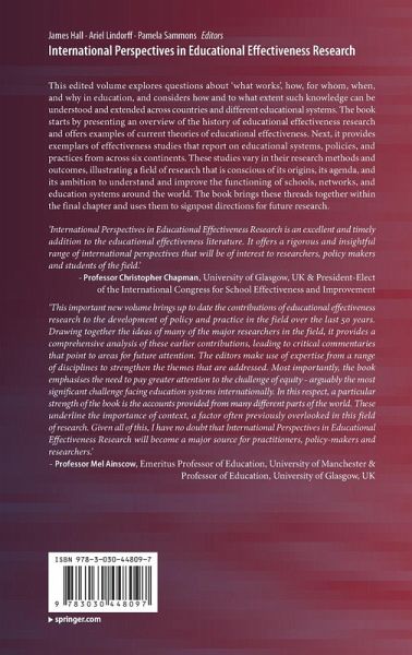 'This important new volume brings up to date the contributions of educational effectiveness research to the development of policy and practice in the field over the last 50 years. Drawing together the ideas of many of the major researchers in the field, it provides a comprehensive analysis of these earlier contributions, leading to critical commentaries that point to areas for future attention. The editors make use of expertise from a range of disciplines to strengthen the themes that are addressed. Most importantly, the book emphasises the need to pay greater attention to the challenge of equity - arguably the most significant challenge facing education systems internationally. In this respect, a particular strength of the book is the accounts provided from many different parts of the world. These underline the importance of context, a factor often previously overlooked in this field of research. Given all of this, I have no doubt that International Perspectives in Educational Effectiveness Research will become a major source for practitioners, policy-makers and researchers.' - Professor Mel Ainscow, Emeritus Professor of Education, University of Manchester & Professor of Education, University of Glasgow, UK